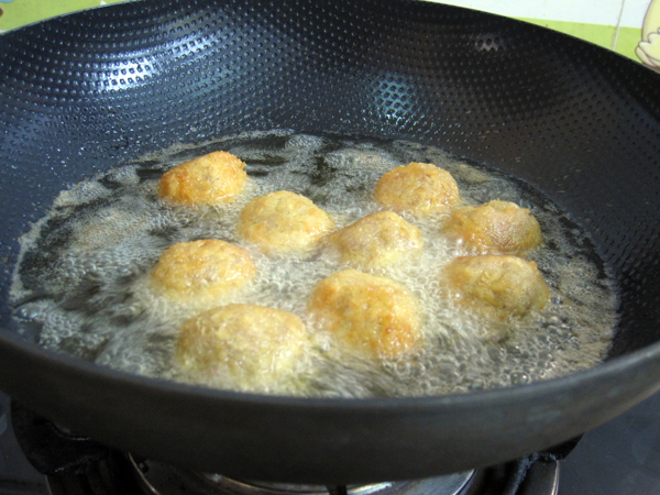 ၅။ ဒယ္ထဲ ဆီမ်ားမ်ားထည္႔၍ ၀က္သားလံုးမ်ားကို မီးနည္းနည္းျဖင္႔ အညိွေရာင္သန္းလာ သည္အထိ ေၾကာ္ေပးျပီ ဇကာျဖင္႔ ျပန္ဆယ္ထားပါ။